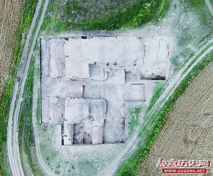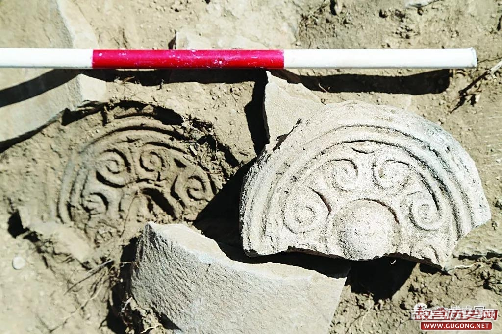 2018年继续对石城子遗址进行考古发掘,发掘范围涵盖城门门道及内侧遗迹区以及城西墓葬和陶窖。在城门门道及内侧遗迹区布方24个,发掘面积600平方米,清理出门道1条、门墩2个、房址4间、柱洞35个、柱槽7个、排插柱20个,踏步3条和沟槽1道。门道顶部已坍塌,四壁用土坯包砌,表面抹草拌泥,底部在草拌泥上涂白灰,白灰上再涂抹红色颜料,最多有5层草拌泥和10层白灰。门道两侧对称分布排插柱,柱内残留有烧焦的朽木。门道内有大量坍塌瓦片和土坯,从保存现状看,有两次修建过程。门道底部残存木质门限和门枕,均已烧焦。门道长13米、宽4米;门限长4米、宽0.16米;门枕长1.8米、宽0.1米。门墩构筑结构与城墙一致,均为夯筑。南、北门墩分别长6米和5.8米,夯层厚约9~13厘米。房屋4间,其中F1打破F4,屋内地面上残留有大量坍塌瓦片和少量的陶器残片,瓦片下有红烧土、灰烬、木炭等,火烧痕迹明显。个别房屋内有柱洞。F1长5.3、宽5米;F2长4.3、宽3.7米;F3长3.5、宽2.7米;F4长10、宽5.2米。柱洞和柱槽主要分布在城墙外侧边沿、房址内部,部分柱洞内残留有木柱和柱础石。踏步呈阶梯状,夯筑,一些台阶上还残存有平铺的木板,木板均已烧焦。沟槽略呈梯形,西宽东窄。发掘部分长约6米。口部最宽处约1米,底部最宽处约40厘米,深约40厘米。出土遗物主要有大量板瓦、筒瓦、瓦当等建筑材料以及陶器、铁、石器和五铢钱币1枚。板瓦、筒瓦的表面均饰绳纹,内壁布纹或菱格纹。瓦当当面基本为云纹或变形云纹图案,个别饰几何纹。陶器有碗、钵、盏、缸等,均为轮制,夹砂灰陶,素面。铁器均已残朽,形制不辨。石器则均为石磨盘。