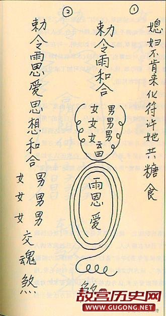 在纸上绘符,书有“迷闷”、“同心恩爱”,配以男女交合、鲤鱼连体、日月相交等形象。