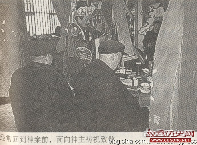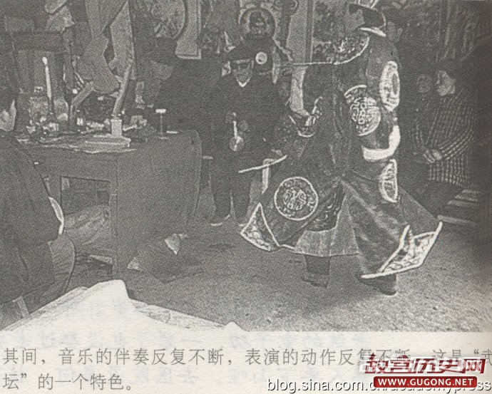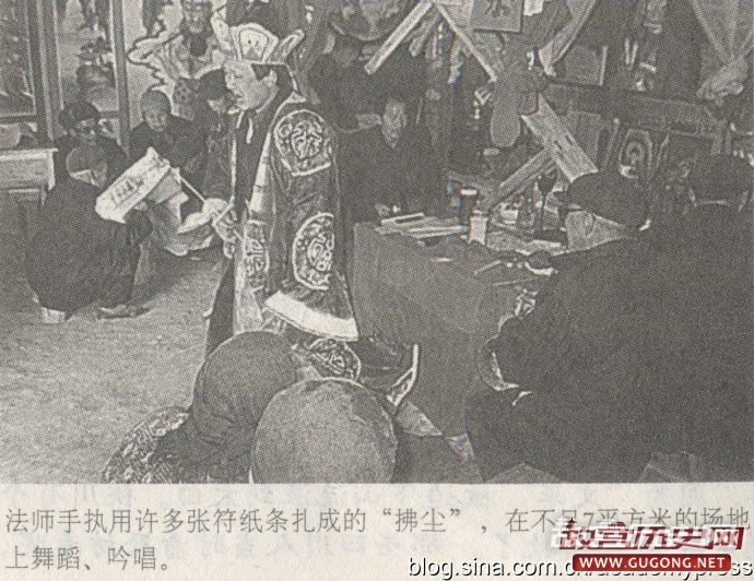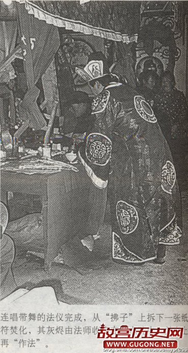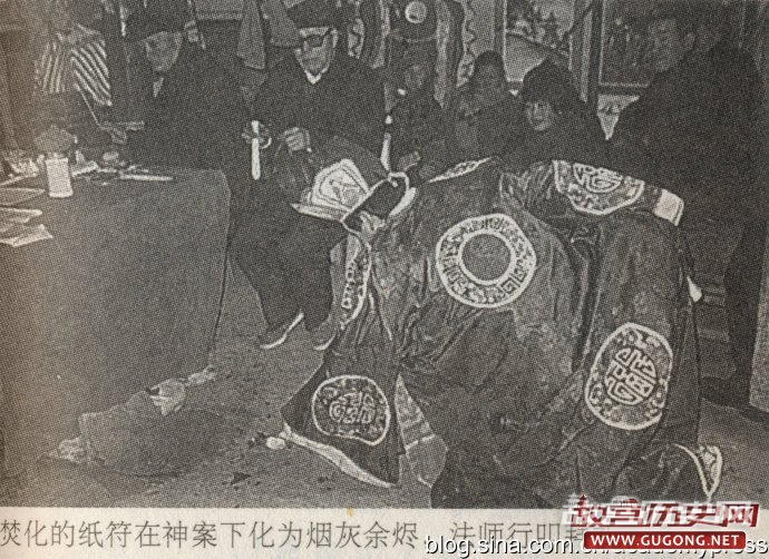像这样的唱段与鼓乐过门反复相连共约 30 多小段,难以尽载。内容涉及病灾、龙虎山、印台山(即耀县药王山)、孙思邈、诸天菩萨、神灵功德,还有一些中药名字组合;对照手头记录下来的《药王经》、《药王咒》,发现它们内容类似而文字句式不相重复。后面 10 多节还增加了众声接唱、对唱的句子,而过门鼓乐则有长有短,因为主场的法师边唱边舞,在鼓乐过门时还要完成一些仪礼动作如叩拜、焚香、焚符、燎四方、化符入水碗等。法师的步式则包括前进后退、左旋右转、走圈子、跺足垫步、抢步、跪步等。那身宝蓝缎子地绣太极、福寿团花纹的法袍袖裾摆拂,整个显得鲜丽、轻盈、飘忽。这段法事末了,法师焚化一绺符纸,集其灰烬入一水碗(碗事先置神案上以法铃罩盖)中化开——这碗“药王水”平日赐给预约患者,现在由老会长上前恭谨接过咕嘟咕嘟灌进肚中。然后法师掇一张凳子在神案前正对神像坐下,手敲木鱼颂《药王经》,这是接下来的“文坛”。全部法事用了一个多小时,最后由法师向药王神灵致礼、退出。全过程中有十来名老太太、老汉跪在殿西南、西北两角落默念跟唱或跟随经师动作适时叩头膜拜。这是我第一次亲睹法事,估算了一下,供经师舞蹈的场地不过 2.5米×2.5米大,具有很典型的山村特征。颉经师事后讲,书符的纸、笔事先都敕过的,可惜当时未注意到他如何敕的。