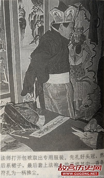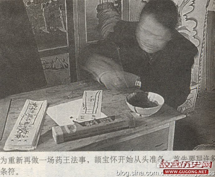 在一块谈得合适,颉宝怀决意为我的采访做一坛法事,演示一下他“食符炼将”、唱忏诵经的“武坛”本事,也就是要把昨天中午那坛药王法事再演一遍,这令一直为迟到而抱憾的我喜出望外。午饭后把殿里西北角窗下那张方桌收拾净擦干,颉经师动手裁了些 10 厘米宽 40 来厘米长的黄表纸绺绺,用墨汁毛笔在上面写了各式各样的符箓。写毕,打开一个包裹取出他专用的服装,开始戴冠、束裙,裹甲(腿胯部)、着袍。旁边有人在帮他用竹筷做柄、把一沓纸符绺绺扎成一柄拂尘。四名乐手在神案两侧坐定,鼓乐合奏过一通,经师开腔是一段快板: