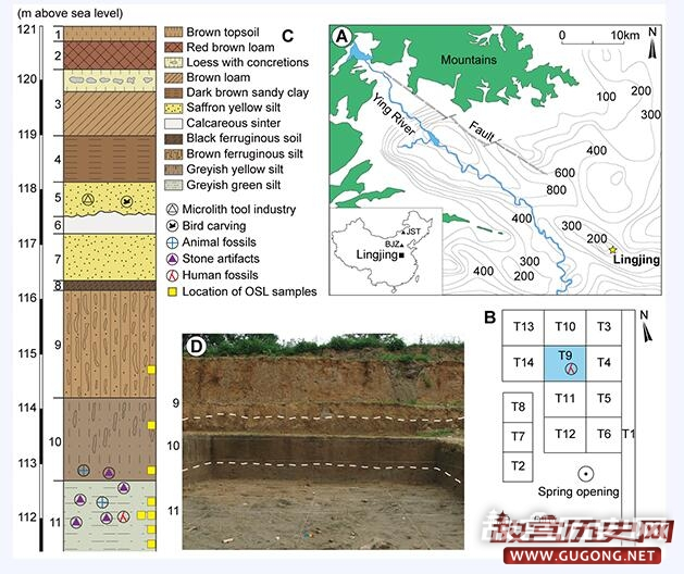 图1:河南灵井许昌人遗址地理位置、布方、发掘和地层图(李浩供图)