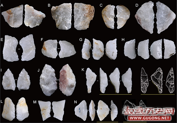 图3:许昌人遗址出土石器:a,b刮削器;c,d锯齿刃器;e,f凹缺器;g,h石钻;i,j,k尖状器;l,m卵石毛坯的工具;n修背工具。k中黄色虚线指示尖状器底部的修理(李浩供图)