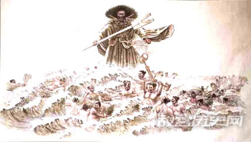 后羿一听是河伯,顿时怒冲心头,冷笑一声,说:“我就是大禹。”说着张弓搭箭,不问青红皂白,“嗖”地一箭,射中河伯左眼。河伯拔箭捂眼,疼得直流虚汗。心里骂道:“混帐大禹,好不讲道理!”他越想越气,就去撕那幅水情图。