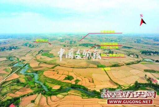 城河遗址鸟瞰及王家塝墓地位置(南-北)