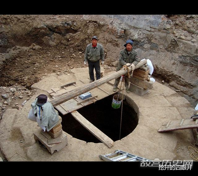 御林军驻扎这里后,人和马用水量很大,这口井被扩大,成为4个人能同时打水的四眼井。清代《洛阳县志》中,对四眼井作了醒目的标注,井栏为方形,中有4个打水口。这可能是汉代时流传下来的基本形状。