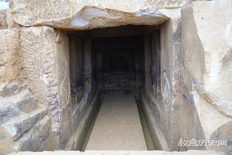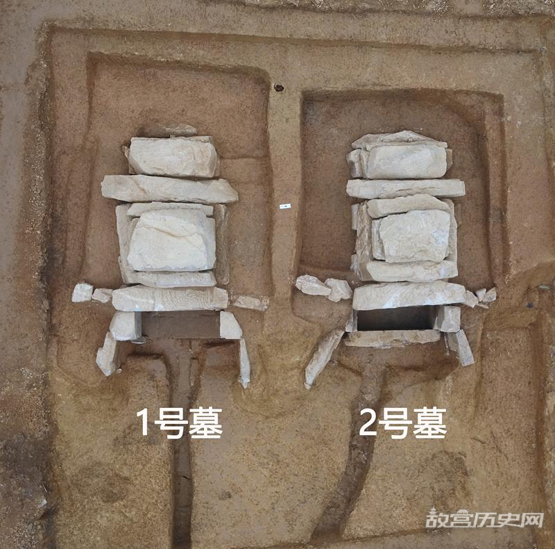 此次发现的两座宋代墓葬均为异穴并室合葬墓,墓葬形制皆为竖穴土坑石室墓并带八字挡墙与排水沟。墓室从前往后依次由封门、廊道、墓门及棺室组成,棺室顶部用藻井。墓室雕刻精美,右侧1号墓雕刻内容包括仿木建筑、六牙象、狮子、四神(青龙、白虎、朱雀、玄武)等图案及“觉”“路”“超”“願”“西方二路”“認意受生”“早”“登”等文字;左侧2号墓雕刻内容包括仙鹤、四神、飞天、摩羯、莲花等图案及“福”等文字。棺室淤填土内出土青白瓷瓷碗、料珠及铜饰等遗物。