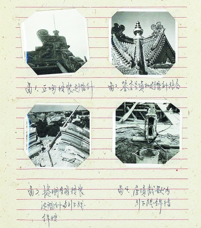 防雷装置的设计——这个重大的任务就落到了于倬云的身上,他立即请来北京建筑设计院的老同学王时煦,与故宫的同事们一起研究。由于国内没有古建安装现代防雷设施的先例,他们决定学习日本和苏联的做法——在古建筑上安装避雷针。“当时国民经济刚刚恢复,设计方案既要做到避雷,又要做到多快好省,同时还要考虑到对古建筑外观的影响。”经过大量的调查与研究,工作组设计出了适应不同建筑类型的防雷装置,并在中轴线较为高大的古建筑上安装。“1957年,故宫的第一批高大、突出的建筑物被安装上了避雷设施。”从资料照片中,可以看到当时在屋脊正吻、卷棚屋顶等位置安装避雷针的情形,特别是一张鎏金宝顶与避雷针相结合的照片,看上去十分巧妙、协调。