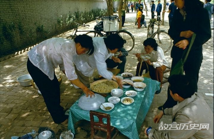 行商坐贾,生活中除了固定居所的饭店,还有一些流动的小生意人。图中路边一张桌子上,几位路人正在吃凉皮。看上去设备很简单,一张桌子几把小凳子。八十年代的时候,做小生意的大致如此。