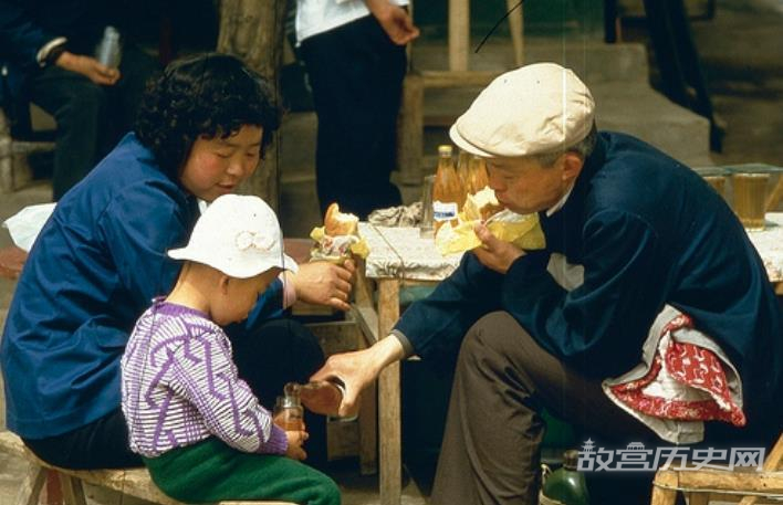 马路边上,两位行人正带着孩子吃早餐。手上拿着简单的油炸食品,桌子上放了几瓶饮料。看得出,那时候路边的餐饮桌子都比较低矮,也没有简单的装潢。