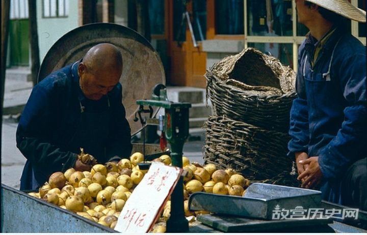 一个鸭梨摊子前,一位大爷正在精挑细选。那时候还没有电动三轮车,多数做瓜果生意的不是拉着板车就是骑着人力三轮车。因为没有电子秤,称重用的还是老式的称重器械。