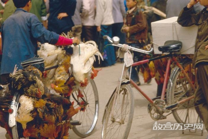 图中两辆自行车,就是当时做小生意的典型代表。一辆载着大号泡沫箱子,一个绑上了十几只土鸡。这样做生意的方式,现在可真是见不到了。
