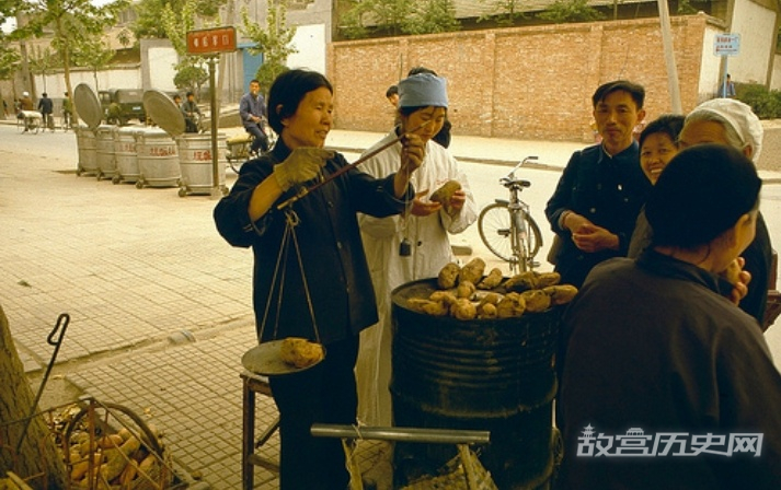 有简单,自然也就有费事一些的。图中是一个烤红薯的摊子,大号煤火上摆满了香甜的红薯,吸引了不少行人。阿姨手上的秤基本靠人工操作读数,不像现在,多数都是电子秤了。