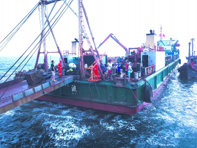 正在抽沙作业的水下考古工作船