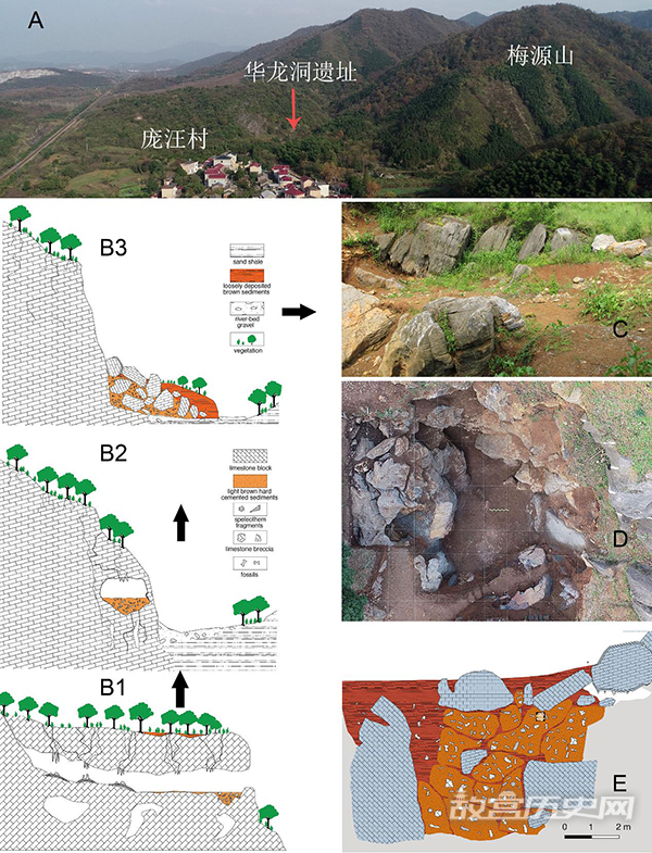 A 华龙洞周边地貌特征;B1-B3: 遗址形成过程模式图;C:2014年华龙洞发掘前景象;D:2016年华龙洞遗址发掘后空中俯视图;E:出土人类头骨化石点遗址纵向切面模式图 (图片来自:蔡演军、裴树文)