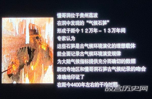 董哥洞位于贵州荔波,在洞中发现的“气候石笋”形成于距今12万年-13万年之间,专家认为,这些石笋是古气候环境演变的理想载体,能全面记录古气候环境演变规律,为大陆气候指标提供充分而确切的数据。尉迟寺地区和董哥洞石笋古气候记录的吻合,准确地印证了在距今4400年左右的干冷时期。