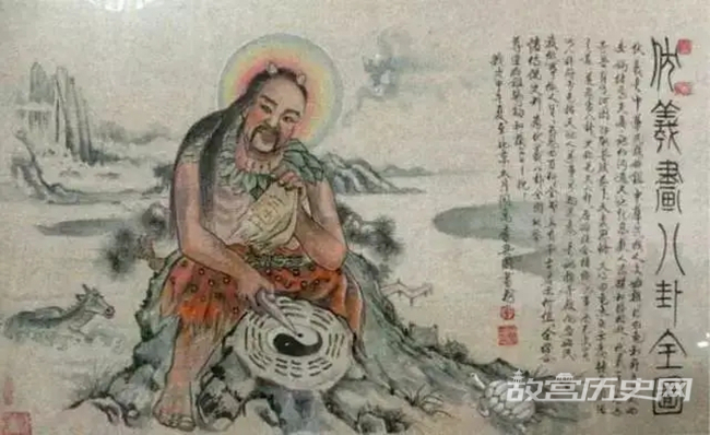 他十分茫然,不知所措。在闲暇之余,时常盘坐卦台山巅,苦思宇宙的奥秘。仰观日月星辰的变化,俯察山川风物的法则,不断地反省自己,追年逐月,风雨无阻。也许是他的精诚感动了天地,有一天,他的眼前出现了一派美妙的幻境,一声炸响之后,渭河对岸的龙马山豁然中开,但见龙马振翼飞出,悠悠然顺河而下,直落河心分心石上,通体卦分明,闪闪发光。这时分心石亦幻化成为立体太极,阴阳缠绕,光辉四射。此情此景骤然震撼了伏羲的心胸,太极神图深切映入他的意识之中,他顿时目光如炬,彻底洞穿了天人合一的密码;原来天地竟是如此的简单明了--唯阴阳而已。为了让人们世世代代享受大自然的恩泽,他便将神圣的思想化作最为简单的符号,以“一”表示阳,以“--”表示阴,按四面八方排列而成了八卦。伏羲一画开天,打开了人们理性思维的闸门,将困苦中挣扎的人们送上了幸福的彼岸,从而博得了人们永生永世的怀念和尊崇。
