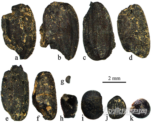 图2 茶岭遗址若干单位出土的炭化植物遗存(a-f:水稻)