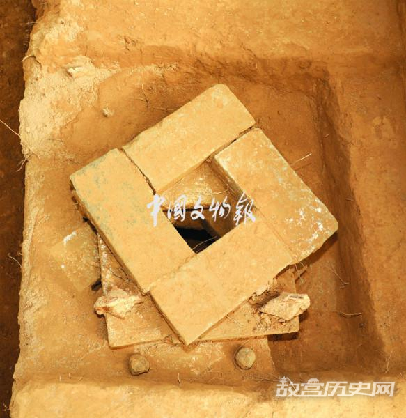 明堂位于M2墓道南侧东部,方形土坑,边长1米、距现地表深1.16米,坑内无地心砖、买地券。其构筑方式为:先在H1中部放置陶罐1件,接着在罐体外围、坑体四面正中处立一坯宽高、两坯厚宽的条砖。然后在坑体南面的条砖两侧各置陶球1枚。最后在条砖上平压三层顺砖,叠涩收顶。其顶部平面为四坯条砖围合而成的正方形。其中,在第二层砖坯的东南及西南砖牙上各置铁犁铧1件。