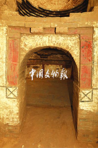 砖砌墓门,外侧仿门楼样式,残高1.85米,宽1.25米。墓门中部设门券,券门高1.31米、宽0.78米,留23层青砖为封,封门方式与M1相似,底部5层与墓道等宽。墓门门额正面设两枚扁方形八瓣朱绘门簪,并以“一顺二丁”砌出立颊。立颊外侧影绘倚柱,立颊下部绘有门础。墓门普柏枋以上部分均已不存。