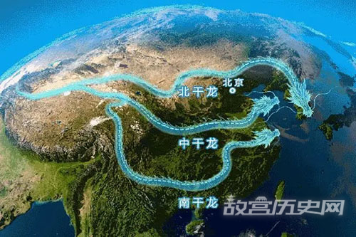 北龙——艮龙发脉:是走黄河以北广大地区。西起昆仑山,向北延伸经祁连山 --贺兰山--阴山--转向大兴安岭山脉与长白山脉,长白山延伸至朝鲜的白头山从而入海。北京、天津等城市处于北龙之上。