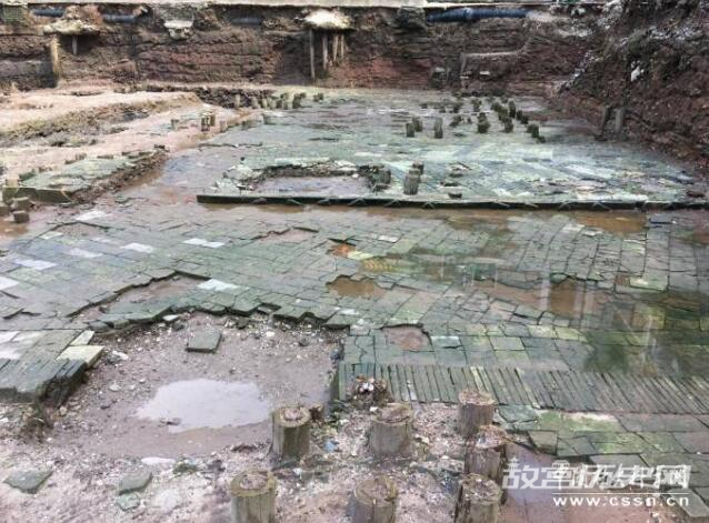 五代南汉时期砖铺地面位于发掘区西部,保存基本完好,清理出来的部分总面积约150平方米。东部原有台阶连接东侧的建筑物,建筑物已不存。地面用青灰砖或黄灰砖铺砌,部分区域呈“人”字形纹饰。砖铺地面中部加建一条东西向砖铺走道,也是“人”字形铺砌,宽3.7米。发掘可知,砖铺地面下面原为河滩淤积,铺砖时先垫一层厚约30厘米的填土,平整后再铺砖。从发掘情况判断,砖铺地面应为一大型建筑群的室外庭院地面,其周边很可能原有成组的大型建筑。结合中山四路考古发现的南汉宫苑遗址判断,该建筑群规模很大、等级很高,应当属于官衙建筑,也可能与佛寺有关。