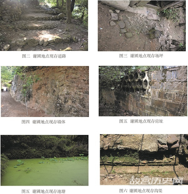 谢圃地点地表尚存的遗迹有道路、场坪、房址、墙体、池塘、沟渠、题刻等共十余处。其中谢圃地点内现存道路共3条、场坪2处,上述遗迹多为卵石铺砌,做工精致,部分保留有波浪形花纹;谢圃中部尚存一处保存较好的大型清代建筑,其平面形状近圆角长方形,残存两侧墙体;谢圃地点现存墙体共3处,多为堡坎,均以石块垒砌,外壁以石灰细致抹面;南部尚存池塘一处,其北壁、东壁系后期改建,应为乾隆《永顺县志》卷一载:“谢圃池,距司治五里,彭泓澎凿”中的谢圃池;谢圃地点发现的沟渠一条,系砖砌的小型排水沟。