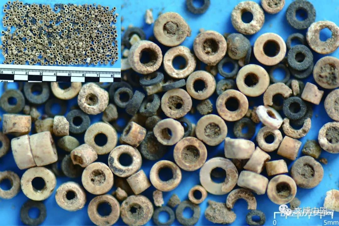 M3随葬品精美。墓主三人头部佩戴的玉串饰,均由30件左右的单体组成,多为扁长方体,少量为圆柱体;扁长方体体量多2.5×2.5×0.5厘米,侧面均以两孔横穿以便连缀,穿孔直径仅有1~2毫米,工艺精湛。出土的骨雕小猪,残长约4厘米,栩栩如生,也是一件不可多得的工艺精品。