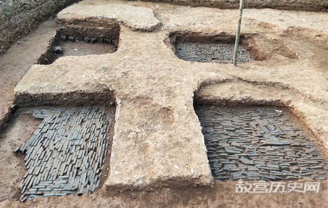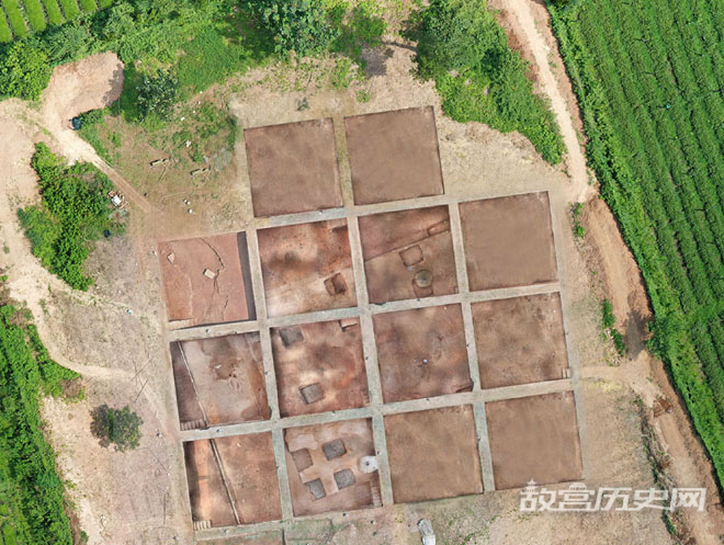 整座基址的夯土台基南北进深20米,东西全长约30米。台基内的磉墩,现已探明的共28个,发掘完成24个。磉墩柱坑为正方形,边长约1.8米,底部为土石混夯,再以细砖侧立铺面,上部又覆盖一层0.3米厚的石板。最顶部原应为露明的柱础石,可惜已遭破坏。同时,台基外缘用厚石板包边,西、北两侧都保存了一部分。每块石板长1.3米、宽0.9米、厚0.3米,体量甚大。