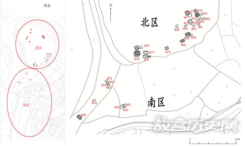本次发掘区域位于洞庭墓群东北的山丘缓坡处,墓葬沿洞庭路方向呈东北-西南向分布。根据地形地势及墓葬埋藏规律的不同,将这批墓葬分为南北两区进行介绍。(图五)