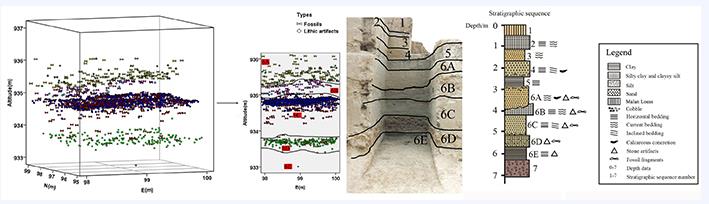 作者聚焦遗址形成过程与早期人类活动的关系,采用国际常用的早期人类活动遗址成因研究手段,对遗址2000-2001年主发掘区(T1)的剖面进行沉积学解读,通过对土石制品类型组合与外表磨蚀状况、废片大小的区间分布、石制品空间聚集特点等指标的分析,结合遗址地层的粒度特征,对五个早期人类和活动的层位(6A、6B、6C、6D和6E)进行系统研究。