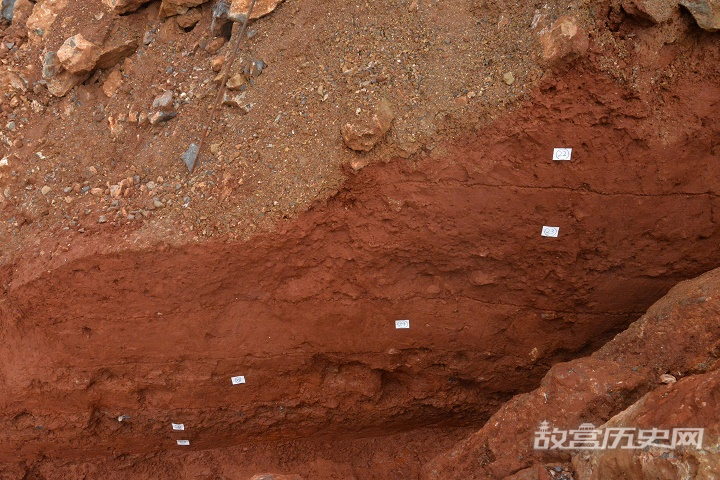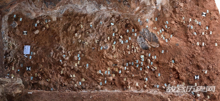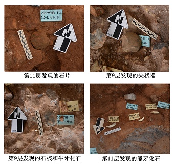 文化堆积包括第3层至第13层,厚度约2.3米。其中第3层至第6层主要由胶结或未胶结的红色砂质黏土沉积构成,为遗址的上部文化层,厚约87厘米;第7层至第13层为遗址下部文化层,主要由胶结紧密的青灰色钙质胶结层与红褐色黏土薄层交替沉积构成,厚约143厘米。遗址上下两个文化层均出土了丰富的打制石器和动物化石等遗物。
