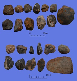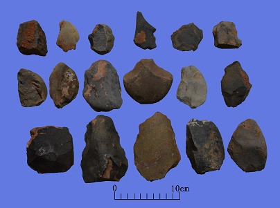 文化层中出土的石制品标本全部为锤击制品,以中小型火成岩砾石为主要原料,其中包括有石核144件、完整和不完整石片191件、工具74件(包括刮削器、砍砸器、凹缺器、尖状器和石锤等,其中以刮削器数量最多,共57件)。
