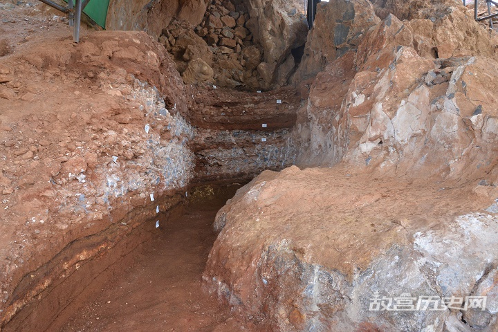 洞穴内部在第12层之下开始局部出露底部基岩,但洞穴西侧堆积则呈裂隙状垂直往下分布至6米以上深度,从而使该洞穴形成“无底洞”。在洞穴下部的裂隙堆积中,第22-25层以棕红色粘土沉积为主,出土有大量大型哺乳动物化石,但没有发现打制石器和其他文化遗物;第26-30层由棕红色、红褐色黏土与钙板的交替沉积构成,出土有小哺乳动物化石数百件,但没有发现大型动物化石和打制石器;第30层以下的地层经过解剖式清理,没有发现动物化石和文化遗物。