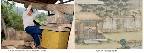 10、压纸:然后上头加木板重压挤去大部分的水干燥后,手工将纸一张张揭起即可(图六)。