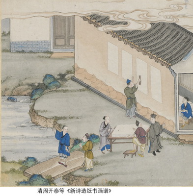 竹纸是以山里的楠竹等为原料,须经砍料、破料、泡料、洗料、晒白、踩料、入槽、打料、抄纸、榨干、焙纸等十几道手工程序。我们在福寿山周围调查走访时,得知当地百姓都曾有过制作粗纸的经历和经验。参考晚明宋应星《天工开物》、清代《新诗造纸书画谱》和清乾隆年间法国传教士蒋友仁绘制的《中华造纸艺术书谱》等文献,我们可以看出大湖坪遗址造纸遗存的工艺流程如下:
