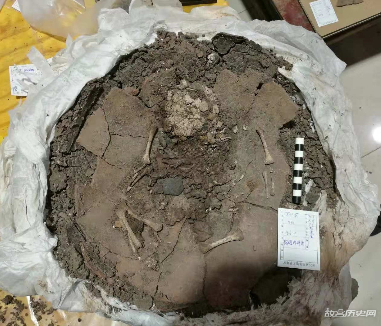 目前,对瓮棺(陶釜)的整理才刚刚开始,尚难以决断。自瓮棺发掘以来,我们就与中山大学合作,鉴于发掘现场难以弄清楚瓮棺的属性,我们将瓮棺全部取回,在实验室内开展更为细致的分析和鉴定工作。2019年暑假开始,李法军教授带领学生前来开展室内清理工作,从已经清理的20余个陶釜内的遗骸来看,所有陶釜内均有小孩的遗骸,且这些小孩的年龄均在1岁以内。目前仅发现1件釜内的遗骸有一件陶盏,其余陶釜内均无任何随身遗物。除了体质人类学的鉴定以外(包括年龄、性别),还将进行古代病理的分析以及伤痕鉴定等,进而弄清楚包括小孩死因在内的诸多问题。目前,我们碰到的这么多的瓮棺,不仅在国内,在世界范围内也是不多见的,由于没有先例可供参考,对这批瓮棺的分析和研究可能会耗时较长。