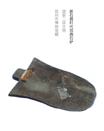 新石器时代双肩石铲,采集于八步区信都镇石福遗址,为国家二级文物,现珍藏于贺州市博物馆。