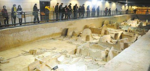 “天子驾六”车马坑全长42.6米,宽7.4米,发掘整理出68匹马,26辆车。 “六驾”车马摆放在车马坑的东南部。整个车马坑的摆放壮观、华丽,表现的景象似为周天子出巡、狩猎时的随行队伍。从两马驾一车直至六马驾一车,完整而直观的展现了周朝的车与制度及出行时君臣、车马应遵循的礼制。