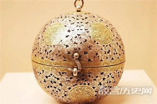 陕西扶风县法门寺地宫出土。钣金成型,通体镂空,部分纹饰鎏金。香囊为镂空球体,上下半球体以合页铰链相连,钩状司前控制香囊之开合。下半球体内有以两个同心圆组成的持平环,铆接香盂于其中并与球体相连。球冠有圆钮,上接U形结构长链。