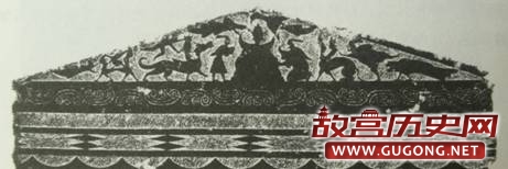 首先,我们看顶角为135度的等腰三角形,它就如同一个大屋顶。而远古时期的人们正是把地面上的天空看作是一个巨大的屋顶。民谣:“天似穹庐,笼罩四野。”穹庐,就是圆形的巨大屋顶。太阳、月亮、星星、云彩都笼罩在这个巨大的屋顶下面。因此,等腰三角形内的符号,应当与天空中的星象有关。这一点,在汉代画像石中屡见不鲜,其中比较典型的一件是西王母与诸天神在一起(图5)。