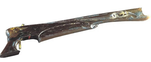 木质冥器。弩臂木制,两侧锥刻云纹,髹黑漆。弩是一种远射程兵器。秦以前的弩长度只有52厘米左右,此弩大大加长,射程就更远。汉代弩的射程一般在一百二十步至二百步之间,约合167-278米。弩有先进的瞄准装置,有臂张、蹶张、腰引拉弓法等。
