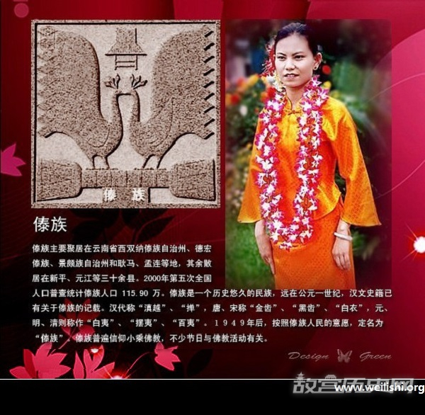傣族,在民族识别以前又被称作摆夷族,是中国少数民族之一,与百濮及百越中的滇越有关,与缅甸的掸族、老挝的主体民族佬族和泰国的主体民族泰族,印度阿萨姆阿豪姆人有历史和文化渊源,语言和习俗也与上述民族接近。在泰国与老挝、越南称傣泐族。