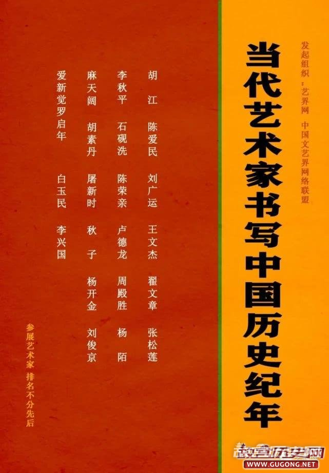 由艺界网、中国文艺界网络联盟发起组织《当代艺术家书写中国历史纪年》,邀请了当代艺术家胡江、陈爱民、刘广运、王文杰、翟文章、张松莲、李秋平、石砚洗、陈荣亲、卢德龙、周殿胜、杨陌、麻天阔、胡素丹、屠新时、秋子、杨开金、刘俊京、爱新觉罗启年、白玉民、李兴国。活动把中国主要历法及起源、与中华文化瑰宝的书法艺术融为一体。艺术家们题写中国历史纪年,并对每一王朝、年号予以精炼的说明。这是一项传承和弘扬中华优秀文化的有力举措,足以使观赏者藉此进入历史庙堂,探幽揽胜,继往开来。