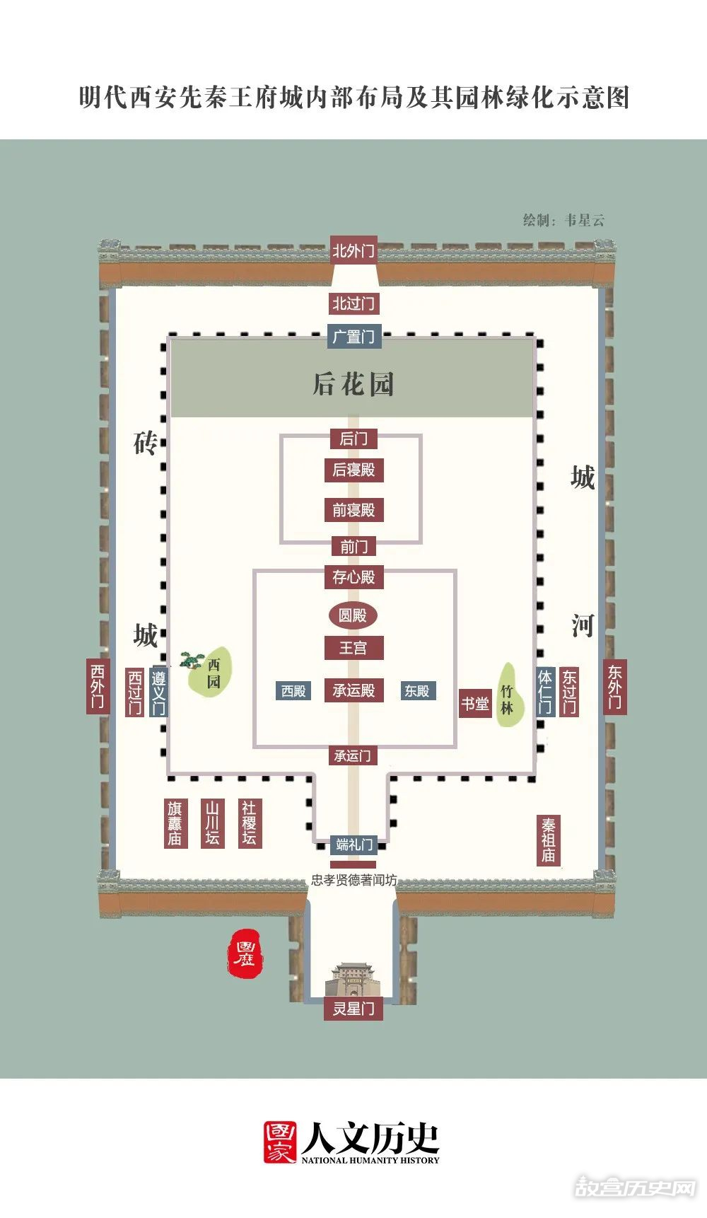今日秦王府城,仅剩内层城墙夯土,但我们从文献中,看得到它往日富丽堂皇,池台鱼鸟之繁华。嘉靖年间,曾任陕西左布政使的张翰在他的《西游纪》中这样描述秦王府的园林: