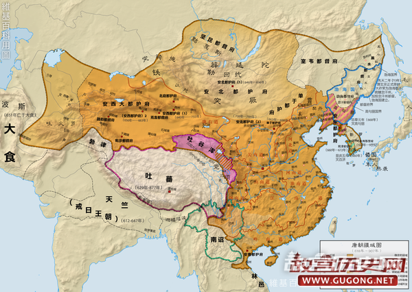 (原日本制的盛唐图不太准确,已删,现在放的是维基百科的唐朝地图)