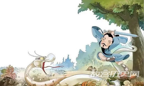 刘邦斩蛇之后,继续前行,又行数里,酒劲上涌,醉卧道旁。第二天早上,有人经过斩蛇之处,见一老妪痛哭不已,问道:“你为什么痛哭?”老妇人道:“我儿子被人杀了。”行人问道:“是谁杀的?”老妇人道:“我儿子本是白帝子,在此化蛇挡道本是向赤帝子讨封而来,却被赤帝子杀了。”