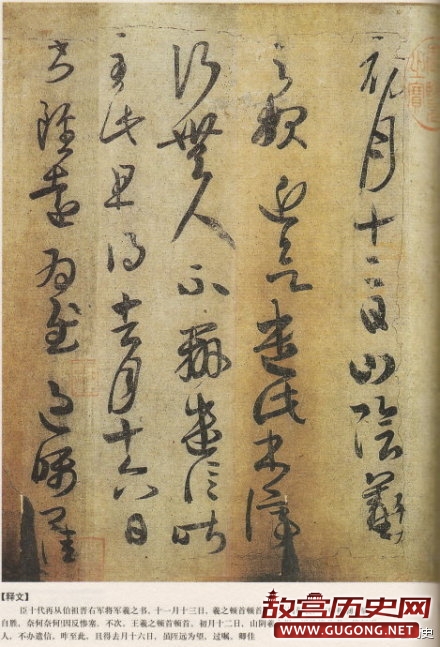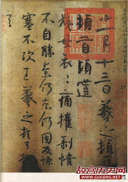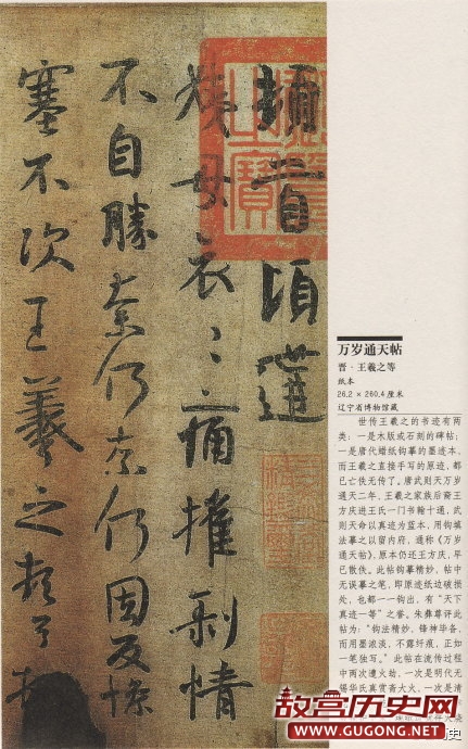 王羲之《万岁通天帖》,文徵明对此帖评价道:“右唐人双勾晋王右军而下十帖,岳倦翁谓即武后通天时所摹以留内府者。通天抵今八百四十年矣,而纸墨完好如此。唐人双勾,世不多见,况此又其精者,固当为唐法书第一。”