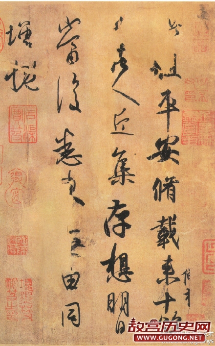 《平安帖》亦称《修载帖》,与《何如帖》、《奉橘帖》两帖连为一纸,也称“平安三帖”。台北故宫藏。原文:此粗平安,修载来十余日,诸人近集,存想明日当复悉来,无由同,增慨。注:帖文部分字迹残损,释文根据《王羲之志(附王献之志)》补出。