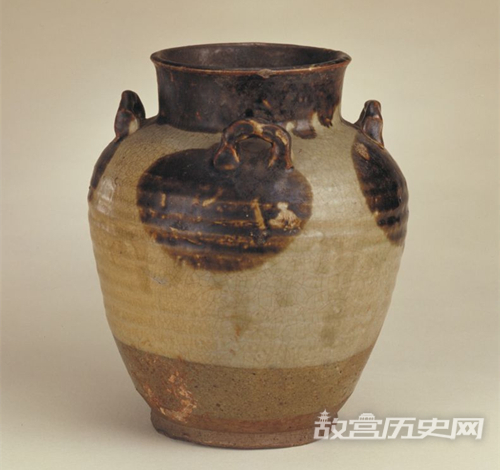 罐直口微撇,丰肩,肩以下渐敛,平底。肩部置四系。通体内外施青灰色釉,外壁施釉不及底,口部及四系处涂以酱色釉斑。此罐为四川邛窑产品。