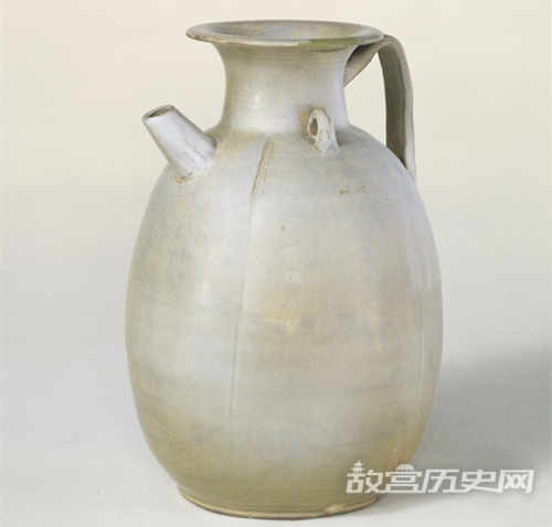 执壶撇口,束颈,溜肩,长圆腹,圈足。通体呈四瓣瓜棱形,肩部一侧置短流,另一侧颈、肩之间置曲柄,与流、柄成十字形的颈、肩之间置双系。通体内外及圈足内均施青釉。